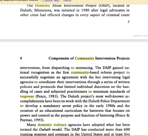 Coordinating Community Responses to DV’ (1999 by Sage, eds. Ellen Pence, Melanie Shepard) Lessons from Duluth & Beyond (p3-4 preview re: DAIP founding, GoogleBk)