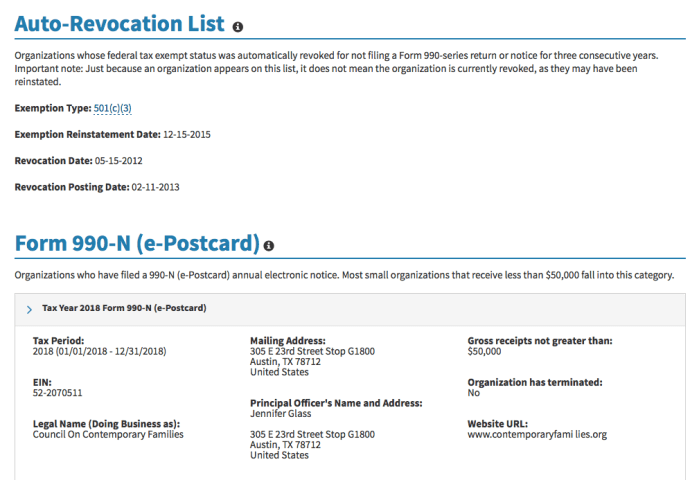 IRS.gov details on “CCF” show it was Auto-Revoked 2012, which was published 2013, and re-instated (as its new “Determination Ltr” also shows in 2015. Below that, the top of four Form 990-Ns filed since (for 2015, 16, 17, and your’e seeing 2018) gives street address (in Austin, TX, website, fiscal year, and principal officer Jennifer Glass.