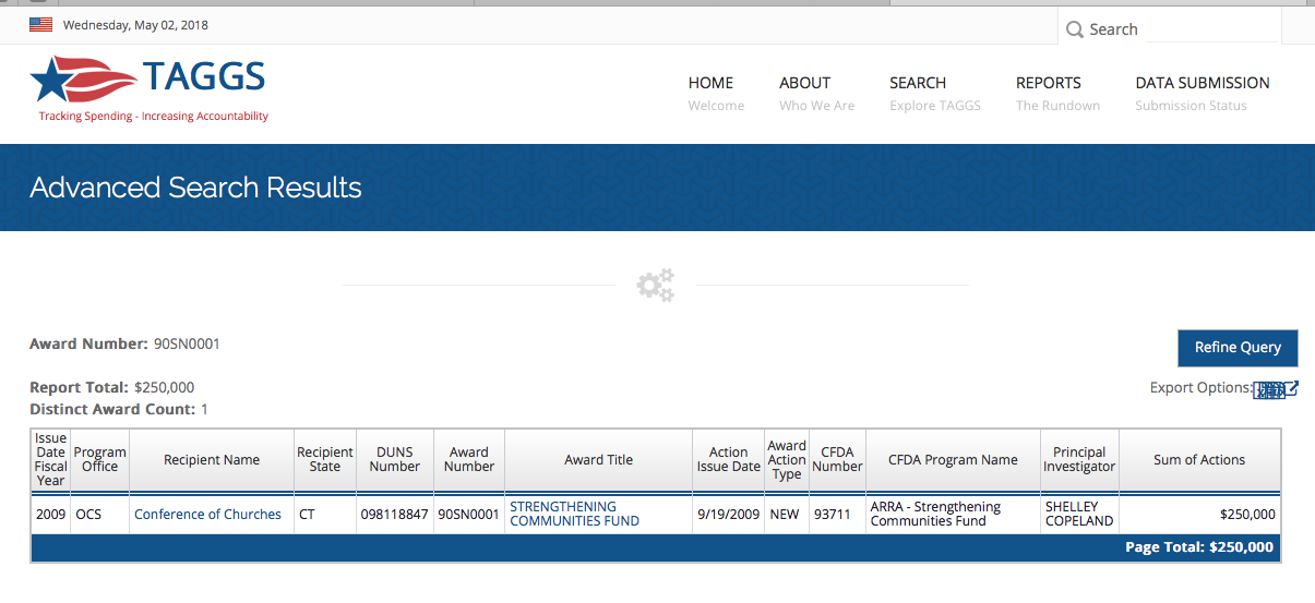 HHS 2009 $250K Grant 90SN0001 to “Conference of Churches” is the only grant shown to this Connecticut Entity. (Searched May 2, 2018)
