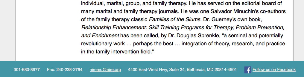 NIRE: Nat’l Institute of Relationship Enhancemt®…(imaged Feb. 2018) | botttom of Bernard Guerney’s “modest” bio blurb showing footer, Maryland address