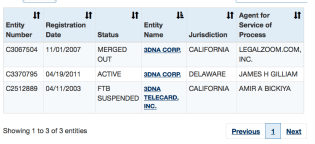 A mildly interesting SOS Business Search in California shows three entities, two of them with Gilliam’s name on them. 3dna Corp in California was set up in 2007 by “Legalzoom” as the registered agent, 1,000 shares of common stock “no par value” and in its one-pager description, took time to make its purpose of indemnifying its owners (or board) clear: