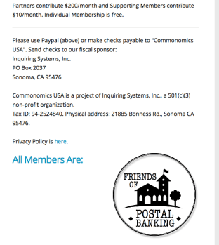 2017 UPDATE – for example, an ISI project (showing © 2015 at bottom of page) has a catchy name, recommends “Postal Banking” (whatever that is) and a typical solicitation page: “Make the check payable to Commonomics and send it to ISI.” So, does Commonomics have its own bank account then, or ISI have multiple dbas and so can cash check from its many on-line website solicitation like this one, as it has been for years?? I don’t know, just asking: