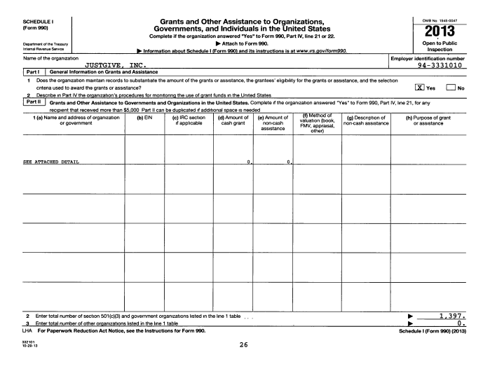 Do You Know Your Social Science PolicySpeak? Can You Name Some University Centers|Key Professionals |BIG Foundation Sponsors|Related Networked Nonprofits| and A Basic Timeline Since at least The Moynihan Report? [First Publ. July 26, 2016,rev.2017 & (minor) 2019. See its tags] » JUSTGIVE.org EIN#943331010 Form 990 FYr2013 – Schedule I Page 26 ONLY %22See Attached Detail%22 (re- $38M grantees|No Totals Filled In)