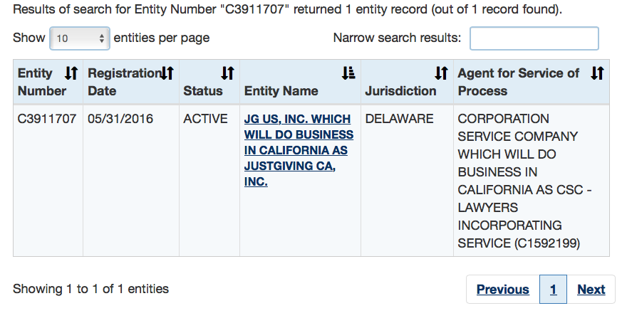 JG US Inc (Cal Entity C3911707) dba JustGivingCA Inc (SOState info as of Nov 2017 (cf to as of my July 26 2016 post) | Search Results (1st page)
