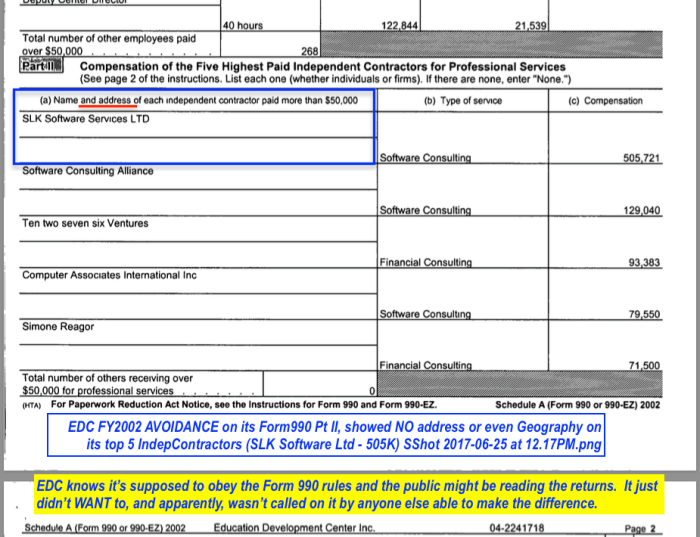 Do You Know Your EDC (EIN#04-2241718 in Massachusetts)? Or Why It Became a Greenbook Initiative ~Evaluation Partner~ Alongside ICF International and the NCSC? If Not, Pls. Look Now! [Orig. 11/15/2016, Rev. & made “Sticky” 6/24/2017][and “UNstuck” 1/27/2018] » EDC FY2002 AVOIDANCE on its Form990 Pt II, showed NO address or even Geography on its top 5 IndepContractors (SLK Software Ltd – 505K) SShot 2017-06-25 at 12.17PM
