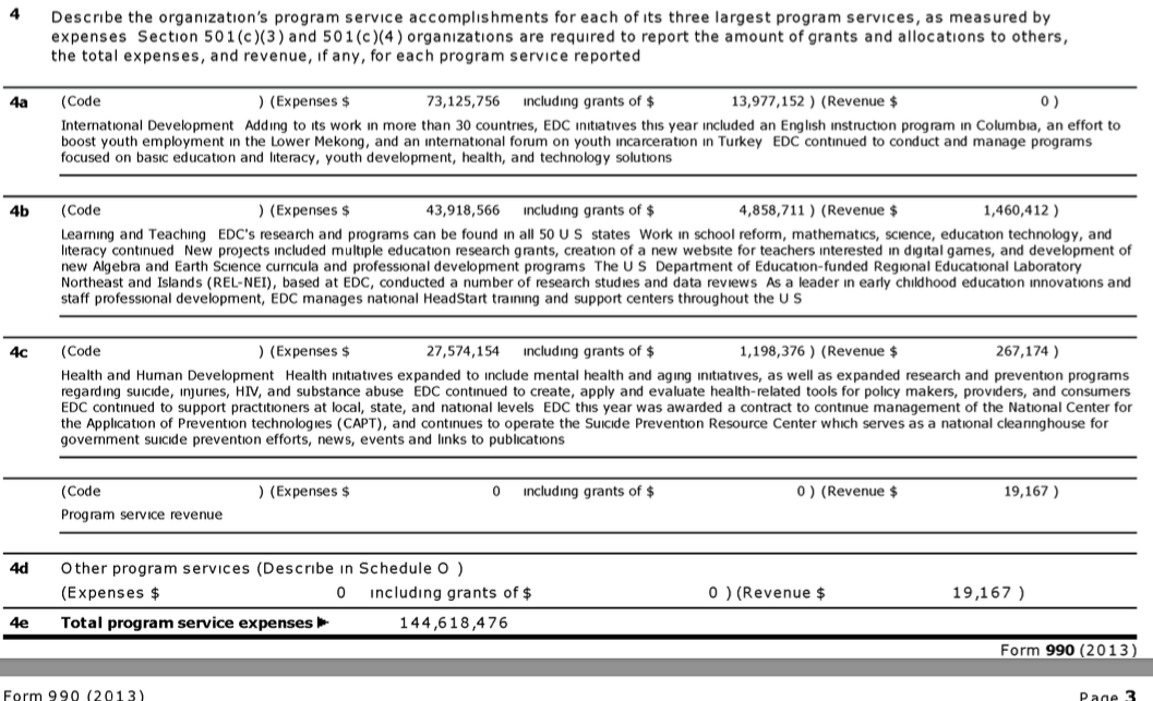 EDC Year Fiscal Year 2013 IRS Form, Page 2 (Program Service Activities, Pt III) no EIN# posted on the page header or footers. Found at 990finder.foundationcenter.org