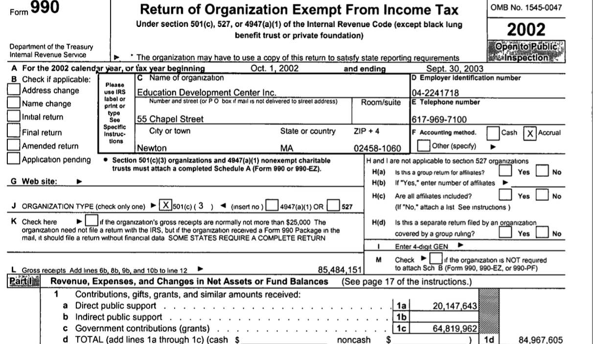 #1 of 5 Images, EDC (EIN#042240218) FY2002 Shows ca. ¾ of funding is govt grants)(Image added post-publicatn 6/2017)