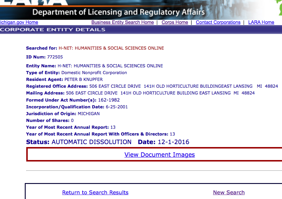 2 of 4 images, H-Net on Michigan’s LARA website, this is the face page showing Admin Dissolution Dec 2016