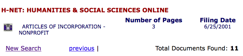 H-Net Page 4/4 on Michigan.gov’s “LARA” database, showing Articles of Inc. show 2001, so why did it take until 2004 to get IRS approval? The host is UMichigan Dept of History