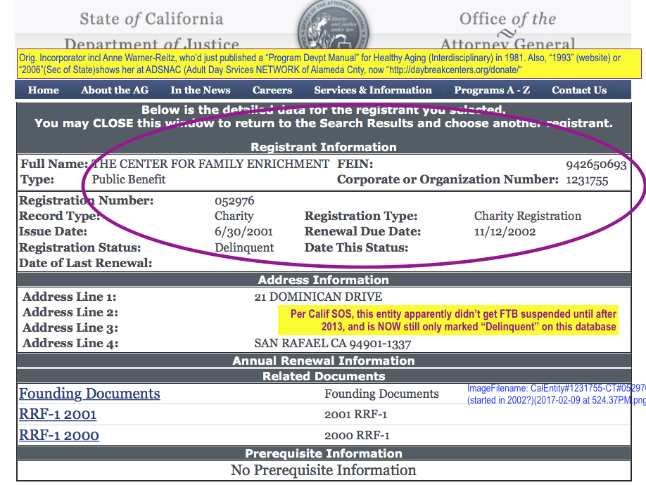 Vital Info: “Sticky” Posts Now Listed Here [Publ. 2/9/2017, rev. 5/26, 6/19, and 10/1/2017] » calentity1231755-ct052976thecntr-for-fam-enrichmt-since1983-char-details-showing-ein942650693-later-grabbed-by-jwallerstein-center-fit-started-in-20022017-02-09-at-524-37pm