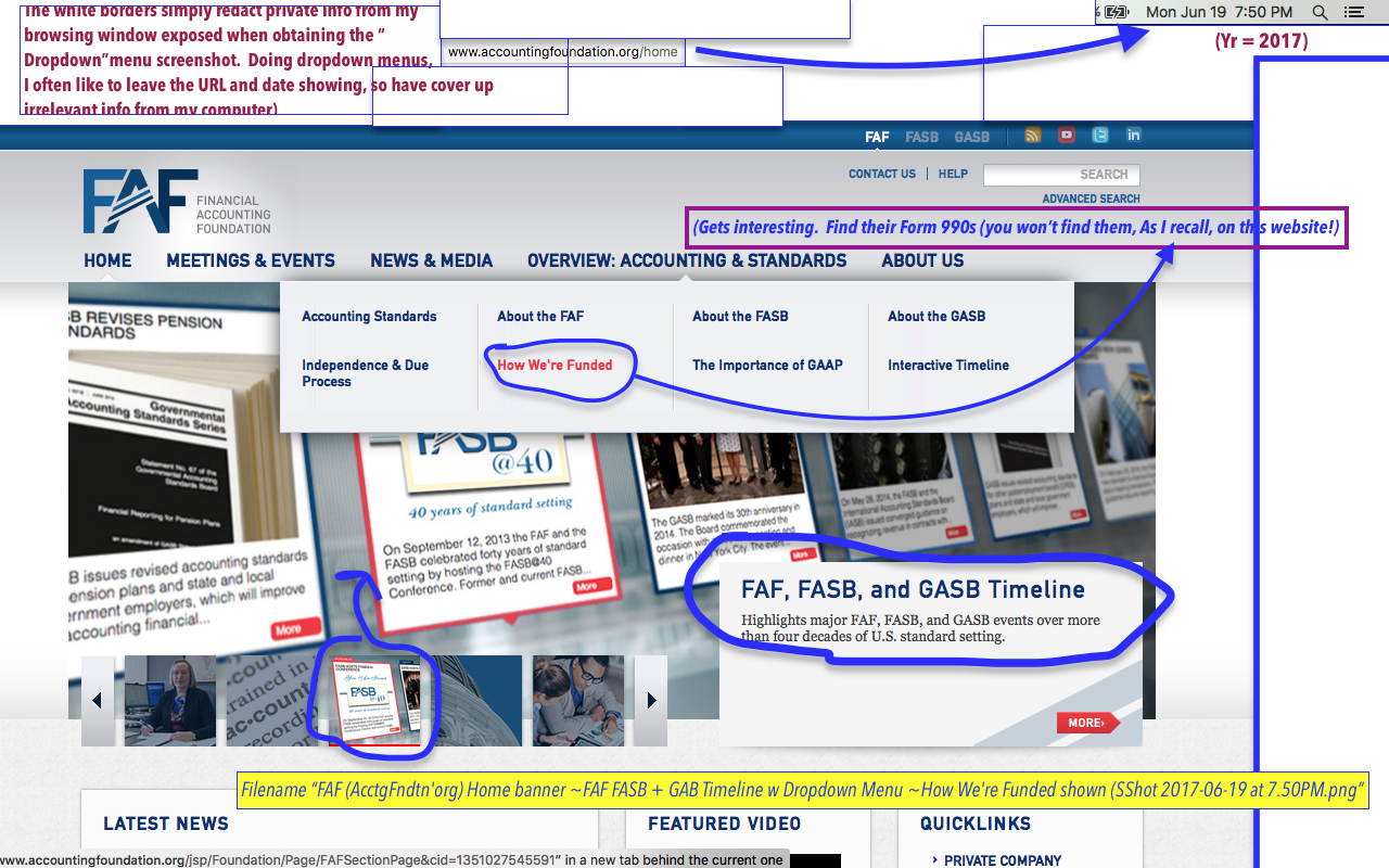 Vital Info: “Sticky” Posts Now Listed Here [Publ. 2/9/2017, rev. 5/26, 6/19, and 10/1/2017] » FAF (AcctgFndtn’org) Home banner ~FAF FASB + GAB Timeline w Dropdown Menu ~How We’re Funded shown (SShot 2017-06-19 at 7.50PM
