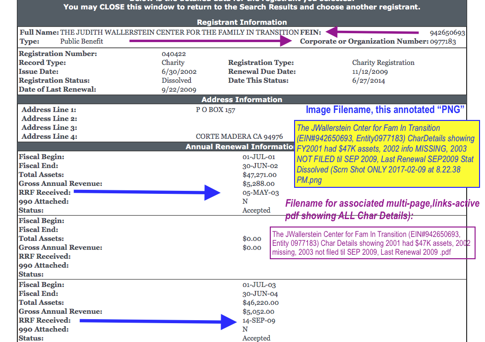 Vital Info: “Sticky” Posts Now Listed Here [Publ. 2/9/2017, rev. 5/26, 6/19, and 10/1/2017] » the-jwallerstein-cnter-for-fam-in-transition-ein942650693-entity0977183-chardetails-showing-fy2001-had-47k-assets-2002-info-missing-2003-not-filed-til-sep-2009-last-renewal-sep2009-stat-dissol