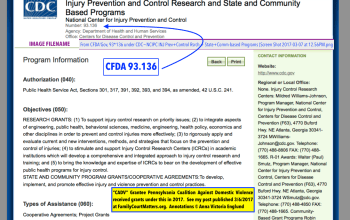 I discovered this after scrolling through the entire drop-down menu at TAGGS.HHS.Gov looking for a sample under the prior CFDA codes (not shown, even when I had no year or any “select” (filter) marked. Among these are (primarily, I think) 93591 (Family Violence Prevention and Services/Grants for Battered Women’s Shelters: Grant [*singular] to State Domestic Violence Coalitions), 93592 Family Violence Prevention and Services/Grants for Battered Women’s Shelters: Discretionary Grants, 93671 (Family Violence Prevention and Services/Grants for Battered Women’s Shelters: Grants to States and Indian Tribes), ALL by way of ACF (Administration for Children Youth and Families) and now 93136 (Injury Prevention and Control Research and State and Community Based Programs)( by way of CDC/NCIPC – National Center(s) for Injury Prevention and Control).