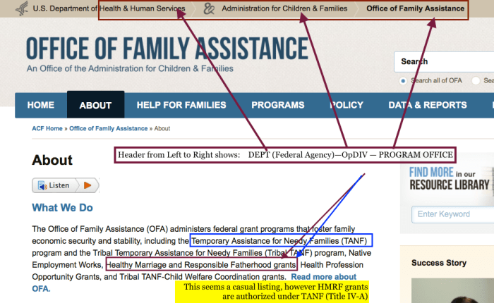 click for full-sized, although this is simply a home page under “ABOUT” at HHS/ACF/OFA referencing the programs, including the “HMRF” ones as well as TANF, it administers.