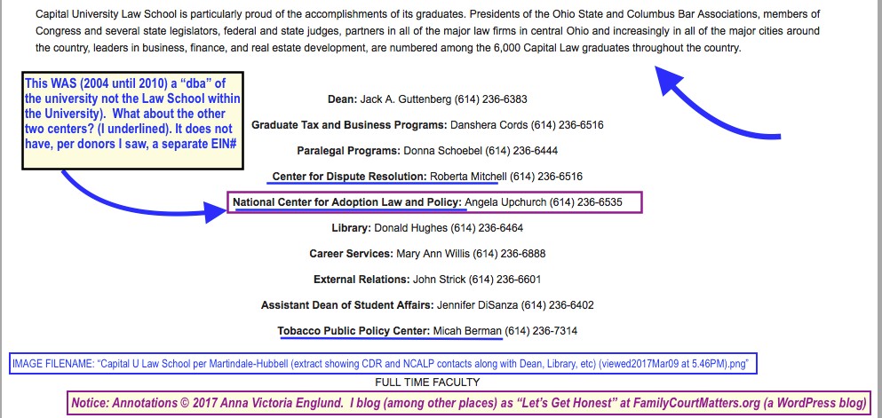 Should the USA join the Commonwealth of Nations? And If Not, Why Should We Allow our Elected Federal and State Officials to sponsor Coordination of Child Welfare, Domestic Violence, and Family Court|Custody Practices, as Ordered (Ordained?) by Appointed (not elected) Experts To Promote Their Personal Beliefs, Practices, and Profits? (A Few Reminders of Who’s Who) » Capital U Law School per Martindale-Hubbell (extract showing CDR and NCALP contacts along with Dean, Library, etc) (viewed2017Mar09 at 5.46PM)