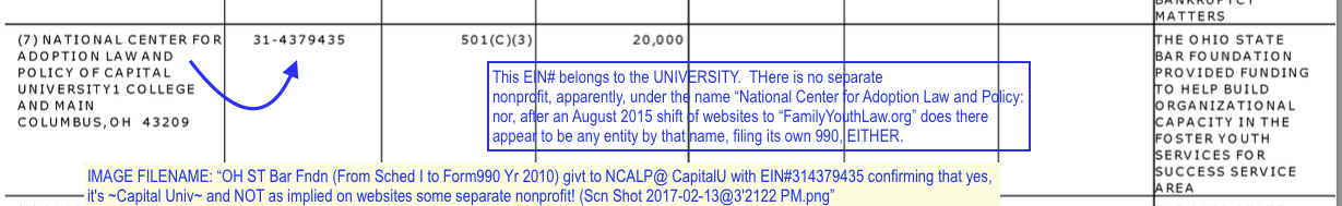 Should the USA join the Commonwealth of Nations? And If Not, Why Should We Allow our Elected Federal and State Officials to sponsor Coordination of Child Welfare, Domestic Violence, and Family Court|Custody Practices, as Ordered (Ordained?) by Appointed (not elected) Experts To Promote Their Personal Beliefs, Practices, and Profits? (A Few Reminders of Who’s Who) » OH ST Bar Fndn (From Sched I to Form990 Yr 2010) givt to NCALP@ CapitalU with EIN#314379435 confirming that yes, it’s ~Capital Univ~ and NOT as implied on websites some separate nonprofi