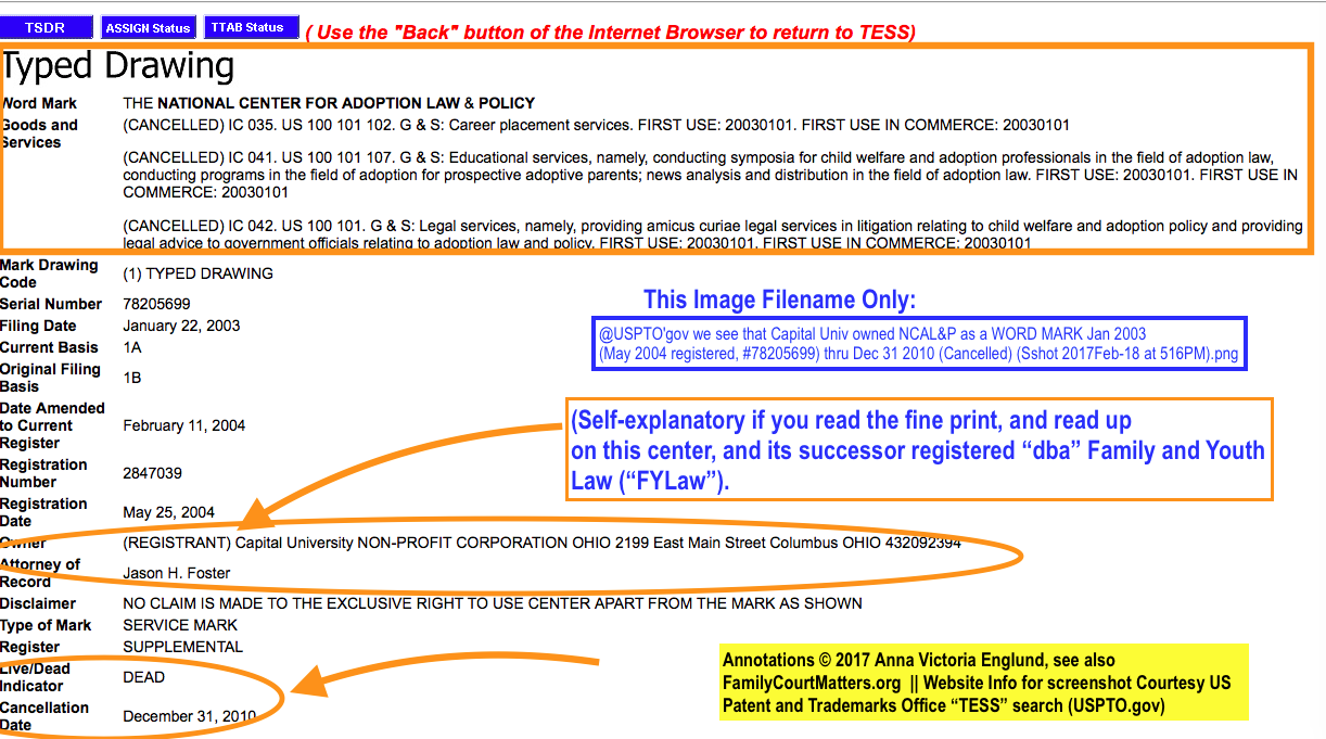 Should the USA join the Commonwealth of Nations? And If Not, Why Should We Allow our Elected Federal and State Officials to sponsor Coordination of Child Welfare, Domestic Violence, and Family Court|Custody Practices, as Ordered (Ordained?) by Appointed (not elected) Experts To Promote Their Personal Beliefs, Practices, and Profits? (A Few Reminders of Who’s Who) » @USPTO’gov we see that Capital Univ owned NCAL&P as a WORD MARK Jan 2003 (May 2004 registered, #78205699) thru Dec 31 2010 (Cancelled) (Sshot 2017Feb-18 at 516PM)