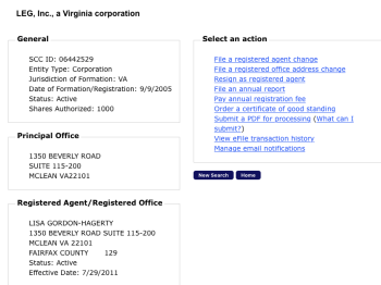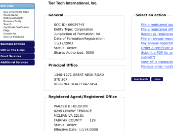 What is this all about? Images further below looking up LEG, Inc. and Tier Tech International…. Well, Virginia Business Entity Search (small link on left-sidebar in a page which reads SCC efile). Search results for “Leg, Inc” where not referring to “a leg up” type entities: