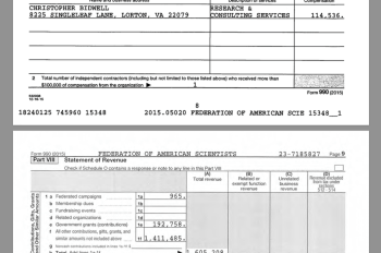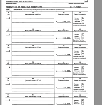 FAS is (a) not that large and (b) primarily privately funded and © among the “Schedule-B listed funders (that year) of just over $1M, $684K from a single source (name redacted, which is legal for Schedule Bs intended for the public), $200K from another, and (not shown in the image, but on the return) another $47K as excess contributor #7 of 7. In other words, it has certain private sponsorship for its tax-exempt purpose.).