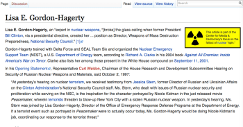 SourceWatch (from “Center for Media and Democracy” whom I’ve blogged as a right-watching left-organization (see also left-watching rightwing orgs) has a page on her. Two images from it, not that I know what to make of it in light of the above under-developed website for a still-active Virginia corporation. It says she was with those in the White House compound on 9/11/2001, and that (for those familiar with the movie “Peacemaker”) in such a scenario, she’d be in the position Nicole Kidman was, as to national security, stolen uranium, preventing a major terrorist event in NYC.