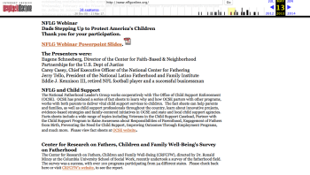 A later functional (see top right sliding bar courtesy the Wayback Machine for date) screenshot from NFLGonline.org. Notice the paragraph on Child Support: “NFLG and Child Support The National Fatherhood Leader’s Group works cooperatively with The Office of Child Support Enforcement (OCSE). OCSE has produced a series of fact sheets to learn why and how OCSE parters with other programs, works with both parents to deliver vital child support services to children. The fact sheets can help parents and families, as well as child support professionals throughout the country, learn about innovative projects, evidence-based strategies and family-centered initiatives in OCSE and state and local child support agencies. Facts sheets include a wide range of topics including Veterans in the Child Support Caseload, Partner with the Child Support Program to Raise Awareness about Responsibilities of Parenthood, Engagement of Fathers from Birth, Preventing the Need for Child Support, Improving Outcomes Through Employment Programs, and much more. Please view fact sheets at OCSE website.” (link doesn’t lead to any fact sheets, just the home page at this time).