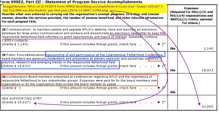 Dear Readers (2017 Themes and Ongoing Concerns) [started 1/19, published in part 2/19, and the whole enchilada 3/21/17] » NFLG on its FY2014 Form 990EZ describing accomplishmts & Costs (incl Grants $29,027) but $32,000 was Bea Haskins’ pay that year (2016-12-08@7.51PM