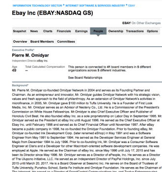 If you’re not familiar with the name Omidiyar (unlikely…), probably you’ve heard of “eBay.” From Bloomberg.com, the Executive Profile won’t fit all on one screenprint, but here’s most of it. Please do read the rest of this just 49-year old billionaire, philanthropist, board member, and “mover-and-shaker” in general: