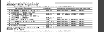 Tax Return Part VIIB, Independent Subcontractors paid over $100K for that year (only 5) shows (with a name that includes “Mauritius”) only one in the USA, and 4 out of 5 are “Software Development Services;” the next image shows where Program Related Investments are held: