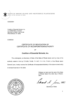 Coalitn of Essential Schools files in RI in 1998, by 2000 notice of revocation for failure to maintain a registered agent (which then did happen!) ||