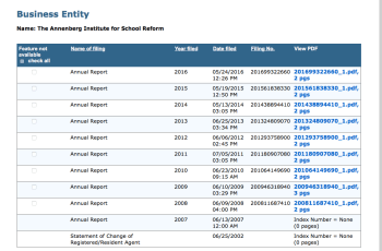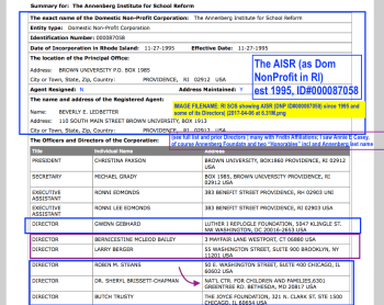 Here in this post, I also added a section on a sixth nonprofit (CES, started out of Brown University in 1984, followed by AISR, an Institute named after its well-known benefactor at Brown, started in 1993) on which [I, “Let’s Get Honest”]] had done some previous “drill-downs” (and was appropriately shocked at the corporate filing history), but not, as I recall, posted yet. This is mentioned here because I feel it significant. It also demonstrates again whose money (such as Walter H. Annenberg of publishing wealth, starting in Philadelphia) is behind some of these reform efforts.