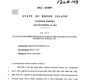 A bill to forgive CES, a “transform the schools”-nonprofit (who meanwhile went “AWOL” to California) its 12 years’ non-filing (i.e., “truancy”) and vacate its corporate revocation — if it catches up now and pays the fees (but, no penalties). Meanwhile, separately (not shown here) an nonprofit copying the CES concept formed in Calif in 2005 (SFCESS), didn’t register as a charity until 2010 and in 2011 (when CES had returned to RI as an address) the incorporator of SFCESS (Gregory Peters) is added in 2011 to CES board of directors. Look at the list of years!