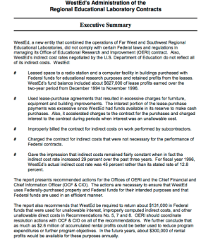 WestEd literally doesn’t seem to provide its own comprehensive annual audited financial statements on its website AT ALL, but I did locate a 1998 OIG Audit of WestEd shortly after it was formed, showing initial practice in administering two MAJOR RELs (Research Education Laboratories) and purchasing and managing a building in Los Alamitos, CA (near Los Angeles) and in San Francisco, shows massive cheating on several fronts. That is, per the US DOE OIG at the time. I did locate a proposal (RFP) for someone to produce those statements for 2017, and if all goes well, 2018, and 2019 by WestEd, which characterized its annual revenue as $160 million.