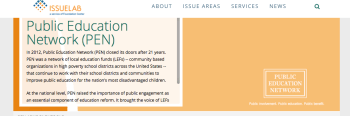 Notice above, that the list of co-publishers with the AISR are a looking like tax-exempts, (anything labeled “Foundation,” will be and I did see the “Center for Collaborative Education is a nonprofit; leaving only two labeled “Institute” or “Program” to categorize. Put another way, here are two images from ISSUELab (organized by “the Foundation Center”) on PEN (Public Education Network) — one describes it. The second shows links (with thumbnails and a mini-abstract for each) “PEN” on the left, and on the right, a colorful image labeled “VUE” (will show up again in this post) and an abstract referencing the AISR at Brown partnering with Pen on a National Commission (etc.). VUE = Visions for Urban Education. Brown University is private, and tax-exempt and its return is shown in this post because I was looking for the financials of the AISR “at” Brown University.