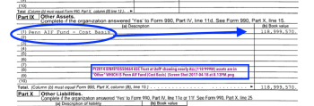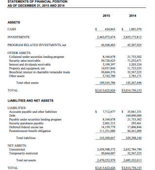 It’s clear throughout this entity doesn’t need any contributions, and isn’t receiving them:  From the start, plenty is made (and distributions are consistently less than) as any “Page 1, Part I summary” with its various columns and labeled rows for categories of revenues, expenses and (at the bottom) balances will show.  Money comes from:  Interest on savings; dividends, and net gain (or loss) from sale of securities, i.e., its investments.  This year ended below $1B (for the first time) and you can see on the image it sold plenty on Line 6a&b.  Later in the return, it’s detailed where at least some of this comes from, and that the $370,000,000 in a certain category at the beginning of the year was in fact, investments from — well, take a look!