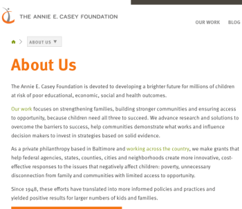 How could anything showing such happy children have anything other than what its claiming to be in its heart — helping children, youth, and poor people? Or, as its slogan (see aecf.org and you’ll see in large letters on an orange background): “Building Better Futures for Children, Families and Communities