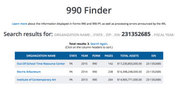 Take a look! You’ll have to ignore the wrong name supplied by the FoundationCenter, again; the EIN# represented belongs to the “Trustees of the University of Pennsylvania” which a small image from the IRS “Exempt Organization Select Check” search page also shows.  Or, just click on any oddly named organization in the table here to see the Form 990 attached to it.