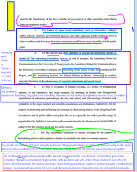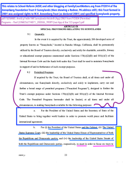 And, I’m not kidding about that last statement — see Article IX of the “Annenberg Foundation Trust at Sunnylands” (a jointly-managed by individual trustees, well trust) with Sunnylands representing a 200-acre property in Rancho Mirage California where Walter (who was Ambassador to Great Britain) and Leonore (U.S. Chief of Protocol), hosted Presidents and leaders, and 2001-2005, continued to set in perpetuity an intentional “Camp David West” scenario by writing certain terms into the trust which would, controlled by Annenbergs, continue to control that property. It’s unbelievable (I mean, the arrogance of this!) (one link for all three pages, annotated images just the first two images): Annb’g Fndtn Tr@ Sunnylands ArticleIX (4pp) ONLY from FY2004 (Permitted Programs — Post!) EIN#256774871_200506_990PF (last 4pp of the 123-pager!) See esp. bottom of page 1, and inside the red rectangle on p.2. The trust currently shows about $550B assets. (By giving both the year and EIN# here, I’m giving enough information to view the whole return, including the rest of the “keep our family in control” Articles or By-laws attached to that return, i.e., previous to Article IX…. The focus on Article IX is “Permitted Programs” and the intentional focus of the estate (the Sunnylands property):