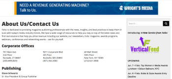 Check out their highly active acquisition and “divestiture” history shown there. I’ll upload the link — it may change, at their rate of buying and selling. (For posterity: Access Intelligence : History and Awards (Viewed Apr 20, 2017) context — following CMP Media~Access publishes FOLIO Mag who had an articleAccess Intelligence : History and Awards (Viewed Apr 20, 2017) context — following CMP Media~Access publishes FOLIO Mag who had an article ) or for now, better viewed directly from the “aboutus/history.html” link above.
