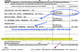 They may not be in exact order (which I may straighten out post-publication). I think an overview of this will help illuminate what’s being done with the “New American Schools” model, which at this point was called a “related” entity of the “Entrepreneur Education Fund” (Same EIN#).