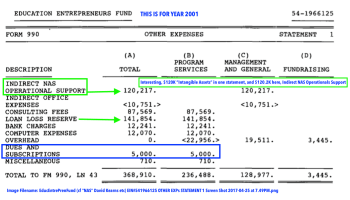 #11 of 11 “Statemt 1” for “Other Expenses” (Educ Entrepreneur Fund FY2001 EIN#541966125), showing $120,217 “Indirect NAS Operational Support” $141K “Loan Loss Reserve” and $5,000 “Dues and Subscriptions” — wonder which ones! Oh yes, ans $87K consulting fees.
