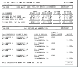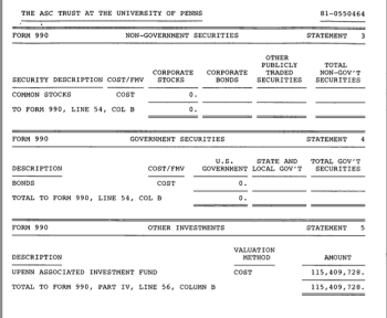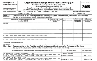 Here’s the link to the Fiscal Year 2005 ASC Trust at UofP, EIN# 81-0550464 I’d mentioned its assets had doubled in a few short years — they did, to $197M at this point (FY began July 1, 2005). Take a look at some of the images particularly page 1 summary which shows that over over $13M earned (Excess revenues over expenses), only $3.75M was donated to the U of P.