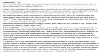 and regarding his academic orientation and positions, this part as an image. Right below that in the quote (on the Wiki) is a paragraph congratulating him as one of three authors which helped win in the Annenberg School Challenge grant for Chicago: