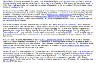 Yes, so Wikipedia on, specifically, the Chicago Annenberg Challenge (link, above) references Bill Ayers, who I believe many should know by now, is married to Bernardine Dohrn, had a background with SDS and the Weatherman, but is still respected in educational circles, and in origins, came from disaffected corporate wealth (a child of the 1960s), and with connections between the two of them also to Northwestern University (Chicago area, some of it in Chicago proper. Dohrn) and (until 2010 when he retired) UIC (Univ of Illinois at Chicago).