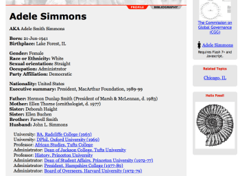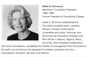 Adele Simmons bio on MacArthur Foundation summarizes her work as its President 1989-1999. Sounds rather international, plus concentrating/ simplifying its programming under just 4 headings (hey — just like Marsh & McLennan Companies also shows…)
