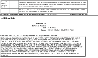 Actually, the Year 2000 tax return of the CPEF above, IS relevant to discuss — after I noticed that even on its “Page 5 of 6 Schedule B Pt. I Excess Contributions” — obviously not ALL the “Excess Contributions for the year” as totaled, still added up (just page 5 only) to about $200K more than is reported on the IRS Form in Part I Summary. Page 1 total Contributions: $1,031,406 or $1.03M. Page5 of 6 (not even taking into account what might have been on pp. 1-4 or p.6 which isn’t uploaded either!) total as written is $1,226,816 or $1.22M (per cell phone calculator). Their CEO that year received a salary of $142,000 + benefits (as the only paid officer or one working FT) for this type of internal discrepancy re: correcting the substandard math & english of Chicago Public School systems!!