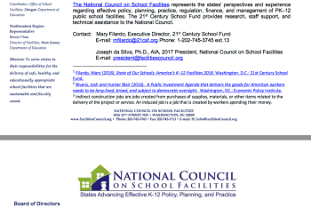 It reads in part (Click Image to View full doc’t): The National Council on School Facilities represents the states’ perspectives and experience regarding effective policy, planning, practice, regulation, finance, and management of PK–12 public school facilities. The 21st Century School Fund provides research, staff support, and technical assistance to the National Council. Contact: Mary Filardo, Executive Director, 21st Century School Fund (etc.) Joseph da Silva, Ph.D., AIA, 2017 President, National Council on School Facilities E-mail: president@facilitiescouncil.org