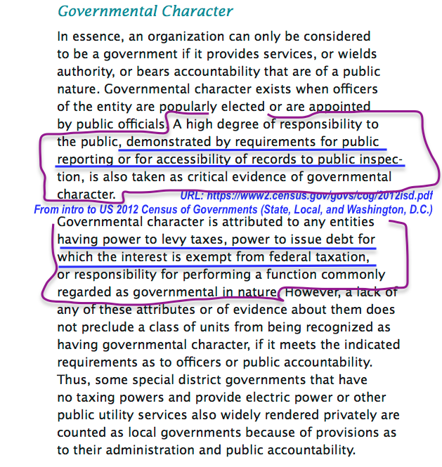 See annotated image (from same pdf, below, right); I circled and underlined two important parts — (1) being responsible to the public, they must issue reports accessible TO the public (Typically, the “CAFR” format). WE SHOULD SEEK THESE AND LEARN TO READ THEM!) and, (2) they can levy taxes (!) and issue debt (meaning, I thinkborrow — when others buy into that debt and are later repaid with interest) for which interest earned on that debt is tax-exempt to the recipient [[i.e., such as bonds, often named after specific projects for which they may be issued — along with the issuing authority, such as — a special district.]].