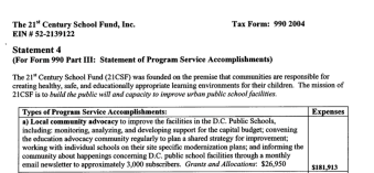 “The 21st Century School Fund, a long-standing {(??First Form 990 only filed in 2003)} advocate for high-quality public school facilities, received a grant from the Advancement Project to provide support to the ad-hoc committee of school facilities directors in order to help plan and launch the Council.
