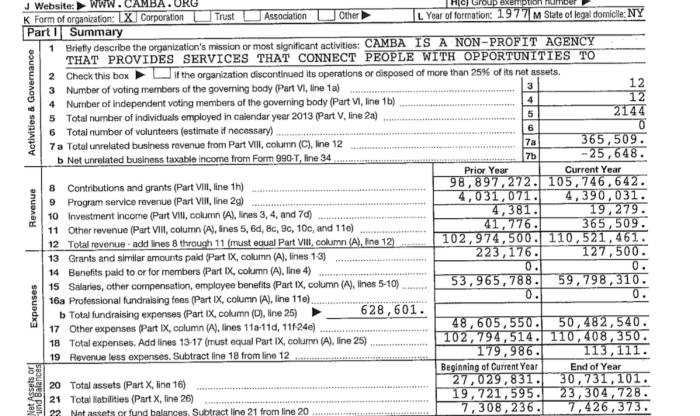 FY2013 for CAMBA, Inc. in Brooklyn, NY. EIN# 112480339 (from their website). Click image for the whole IRS Form 990.