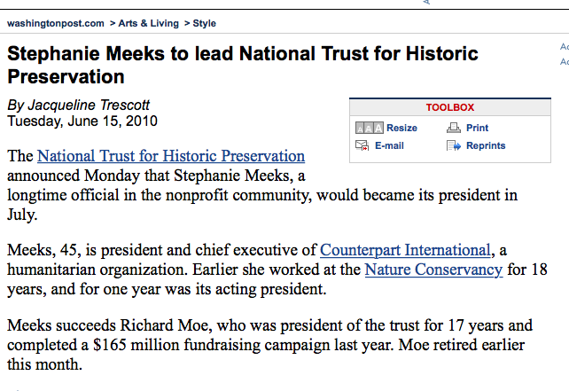 “WaPo” 2010 article on Stephanie Meek’s career transition (referenced from Wiki on the org. mentioned in its title)